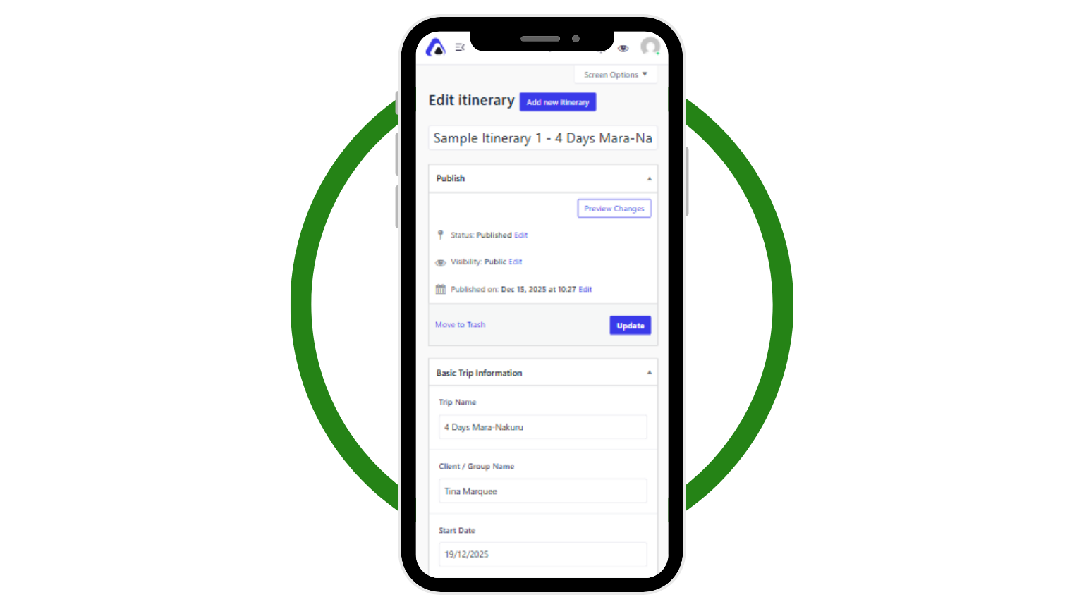 Itinerary data is stored securely and can be updated as plans evolve — great for changing schedules and client preferences.